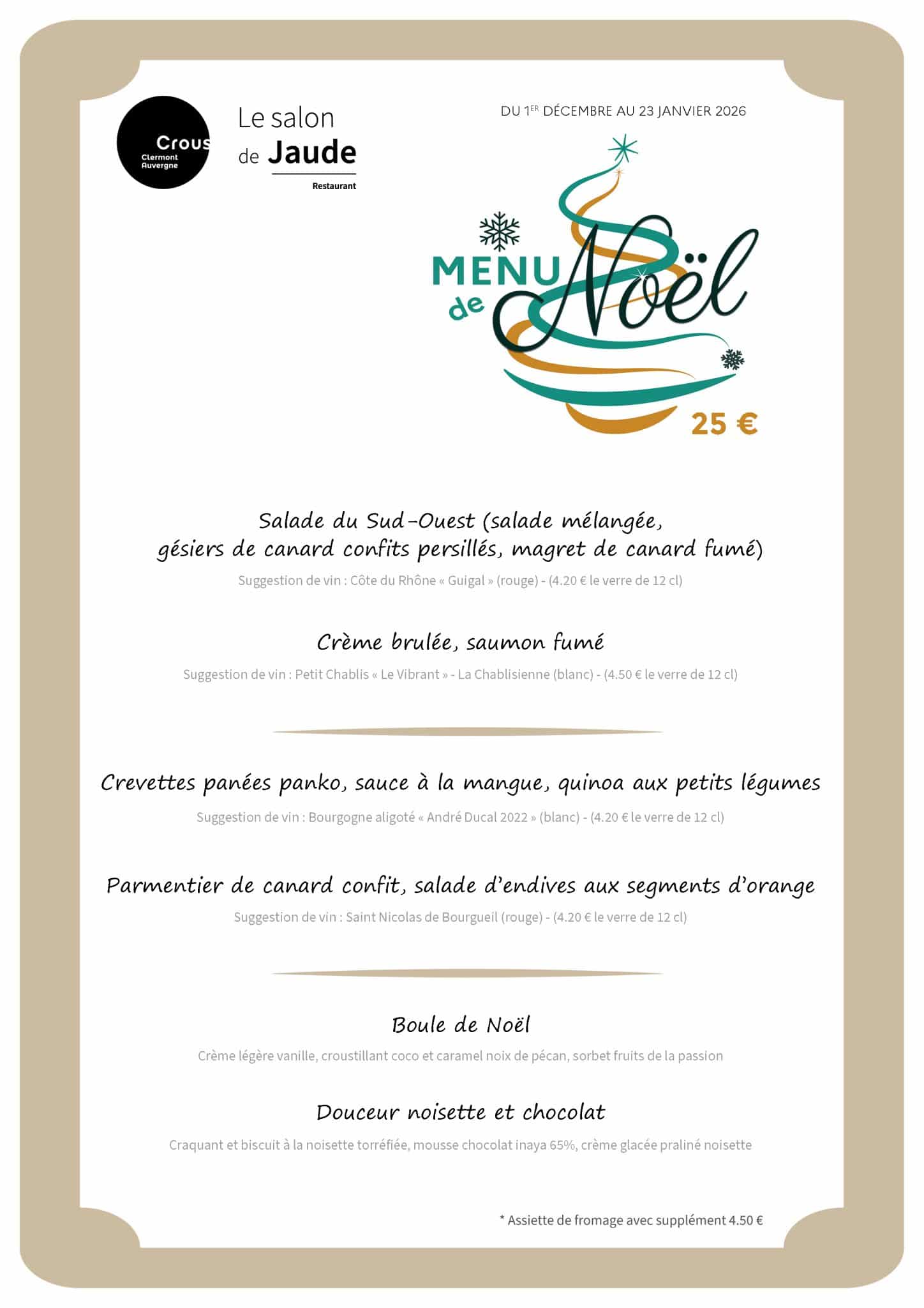En avant-goût de Noël, le Crous Clermont Auvergne vous propose des menus de Noël dans vos Restos U’ et Cafétérias à Clermont-Ferrand, Aubière (Campus des Cézeaux), Aurillac et Montluçon. Des repas de fête à tarif social. Bon appétit !